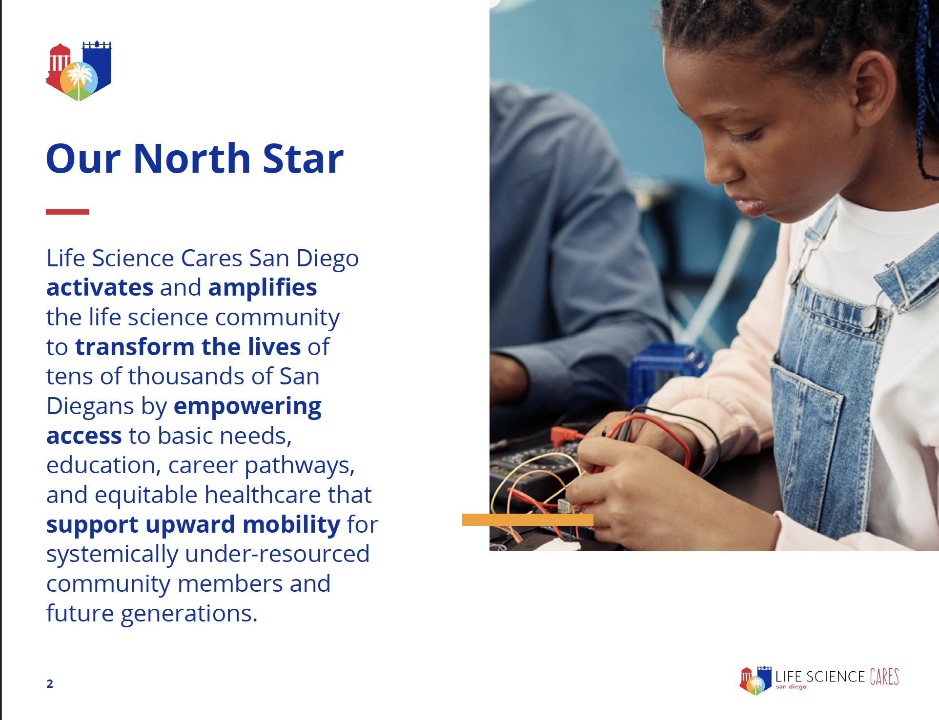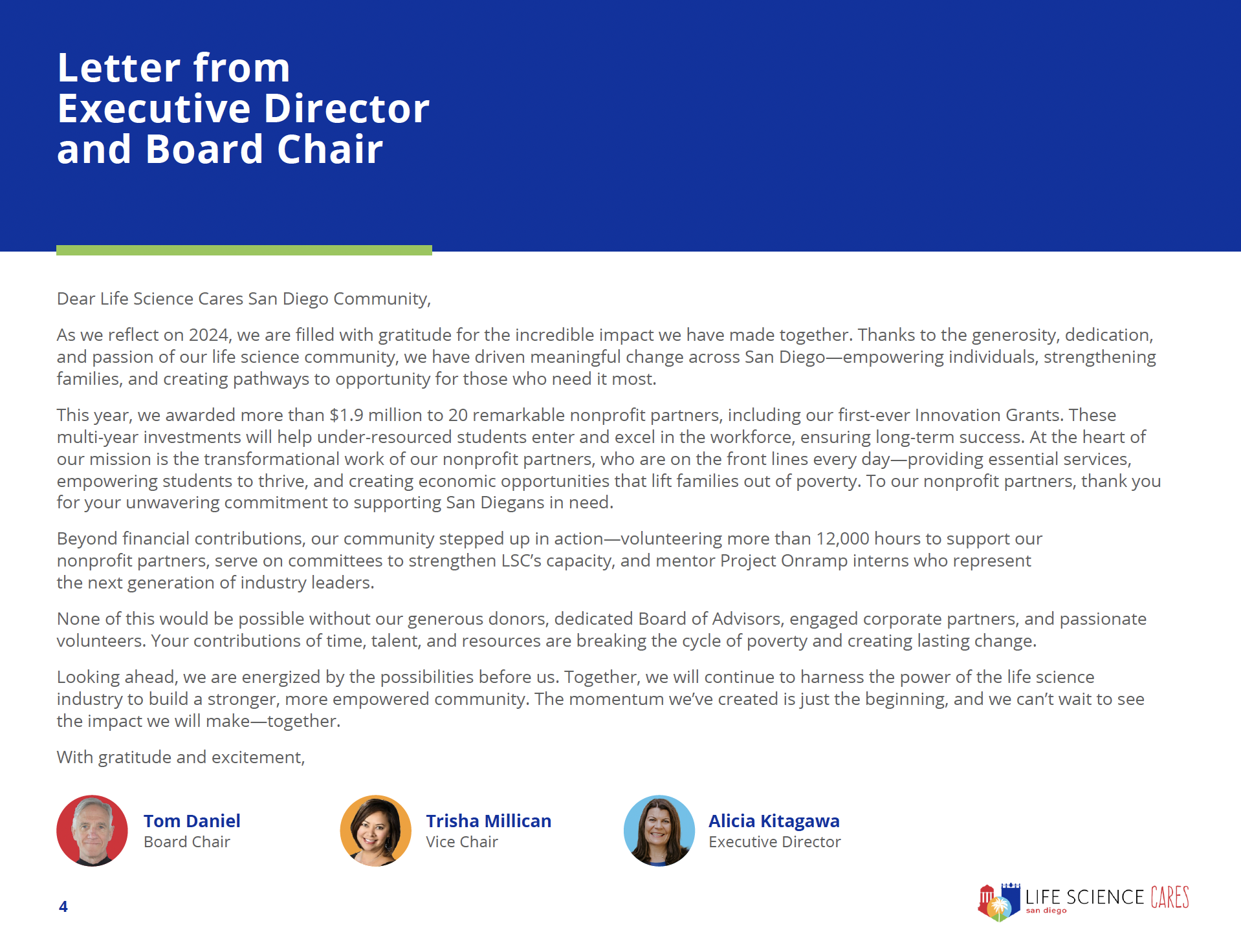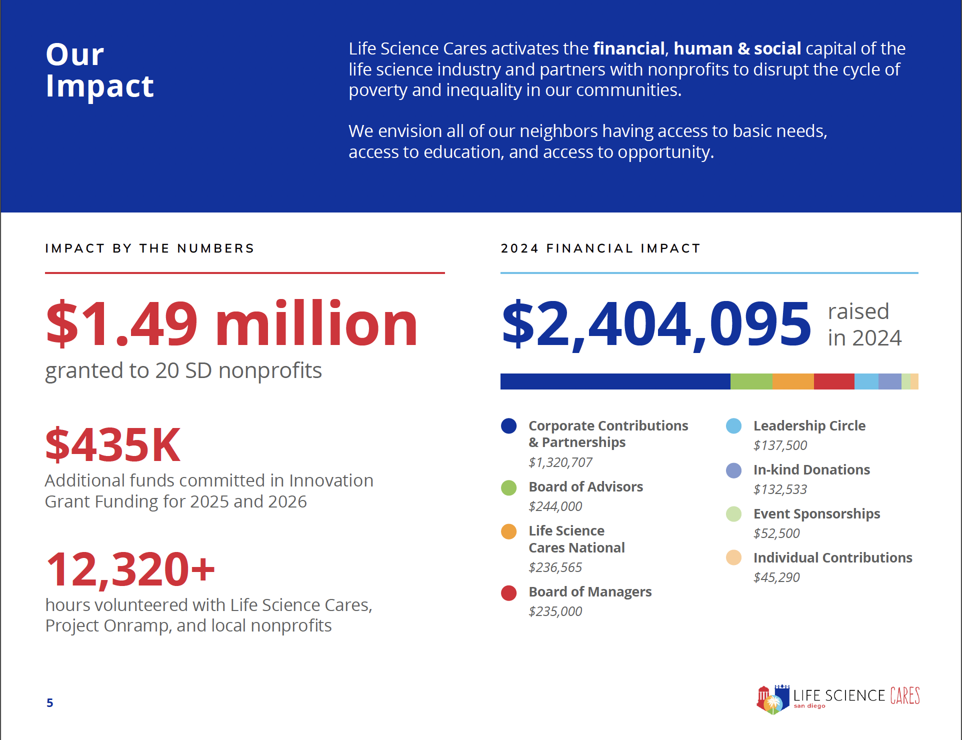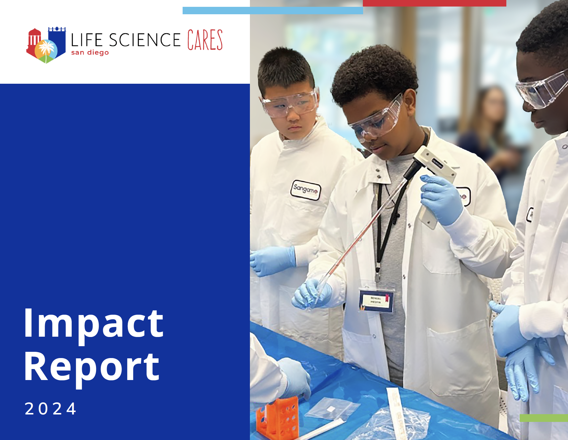 In 2024, the life science community came together to create meaningful change across San Diego. Our Impact Report highlights how your support helped advance access to basic needs, education, career pathways, and equitable healthcare — all in service of building a more just and thriving region.