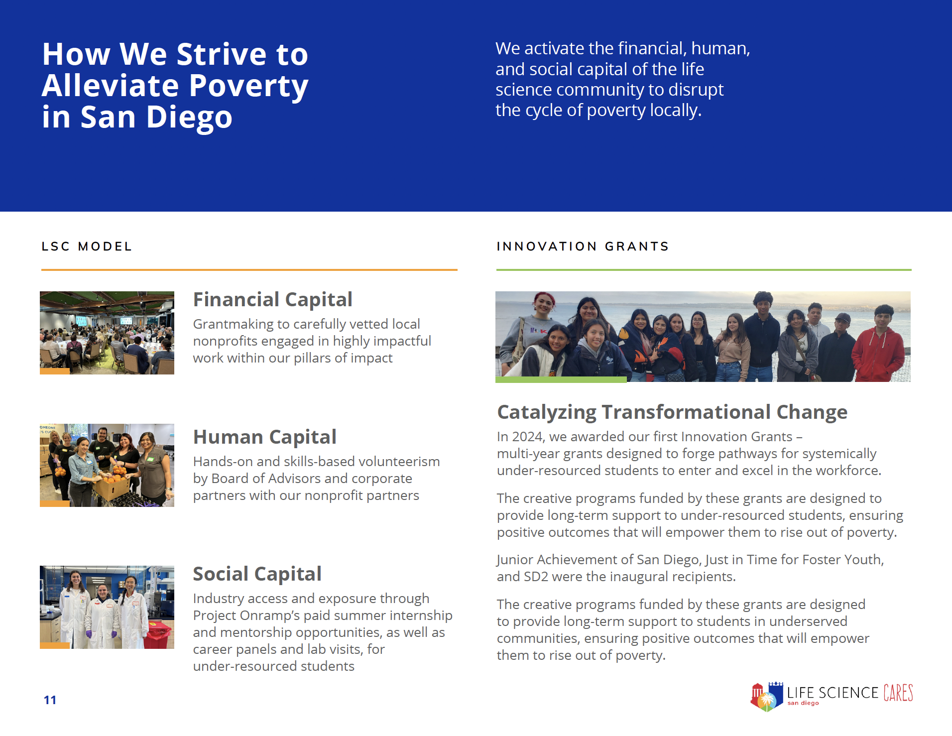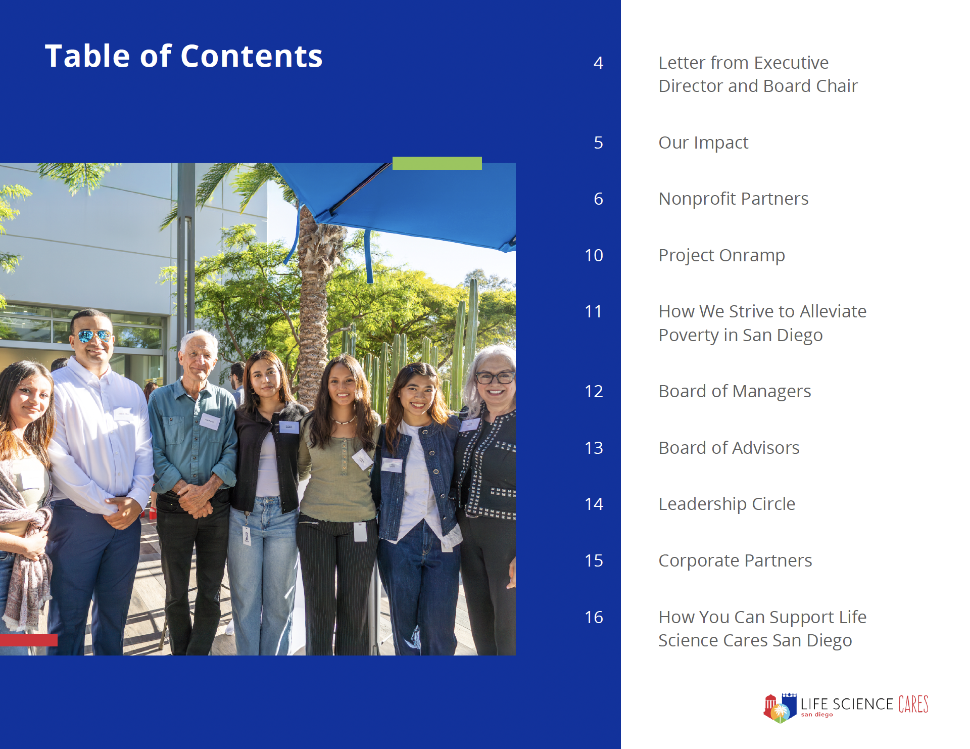 In 2024, the life science community came together to create meaningful change across San Diego. Our Impact Report highlights how your support helped advance access to basic needs, education, career pathways, and equitable healthcare — all in service of building a more just and thriving region.